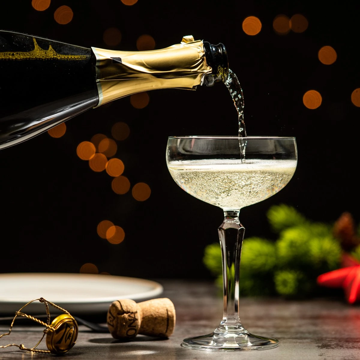 - Vul het cocktailglas met nog een een klein beetje champagne.