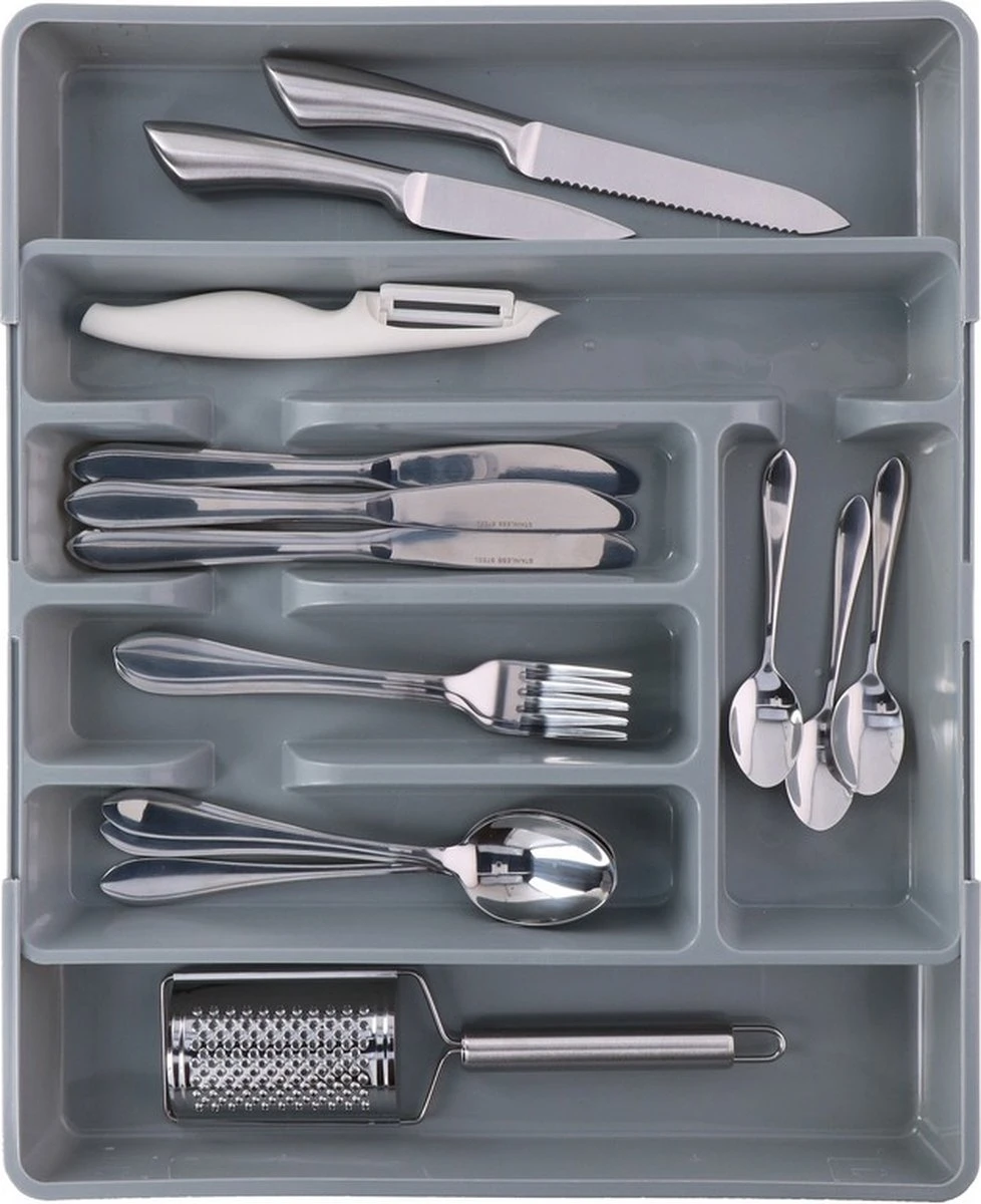 Een uitschuifbare bestekbak, gemaakt van kunststof. Door de zijkanten uit te trekken wordt de bestekbak/bestekhouder groter, waarmee u 5 tot 7 vakken kunt creeren. Afmeting ingeschoven bestekbak: 27 x 36,5 cm. Afmeting uitgeschoven bestekbak: 44 x 36,55 cm. Hoogte: 4.5 cm. Materiaal: kunststof. Bestekhouders/bestekbakken keuken opberg accessoires.
