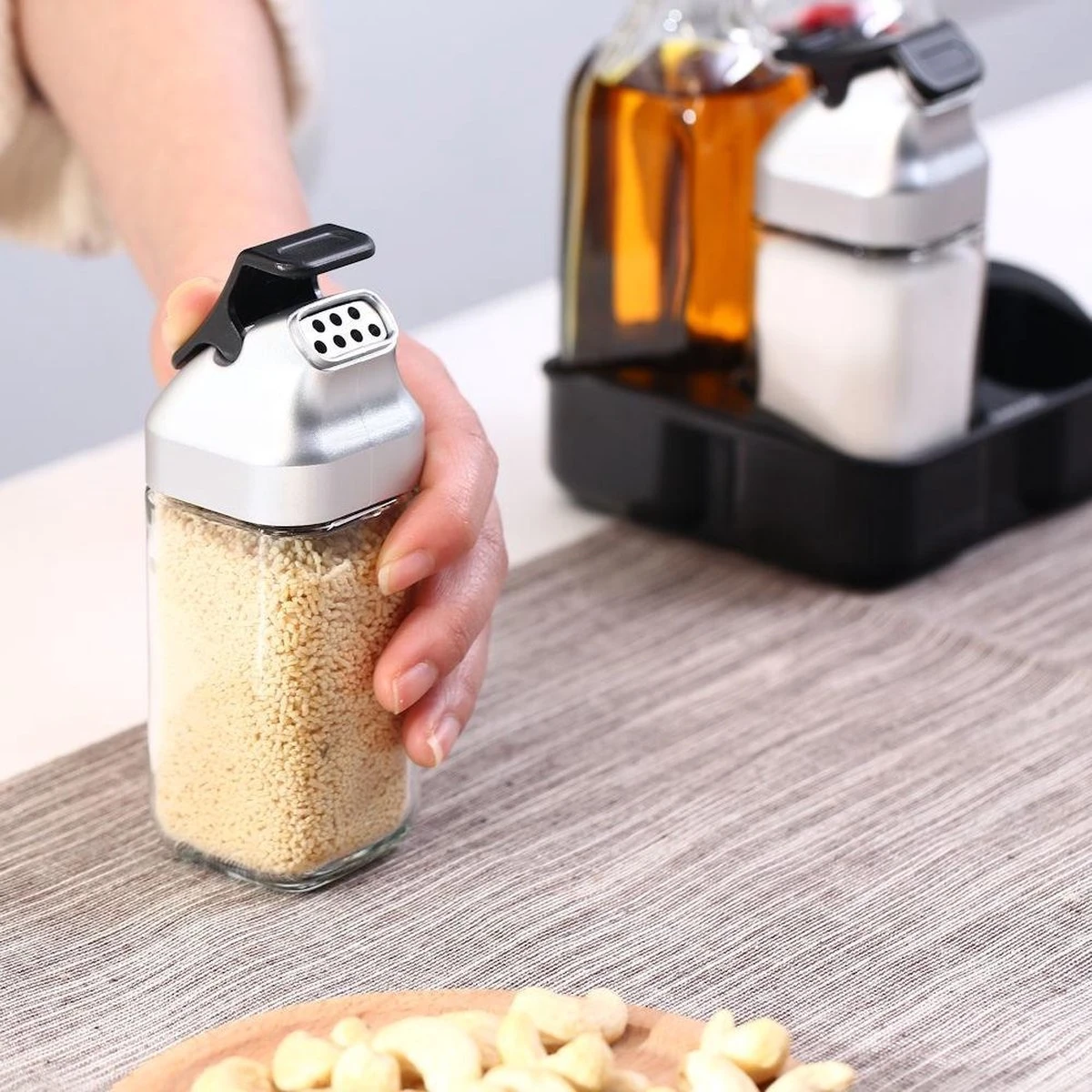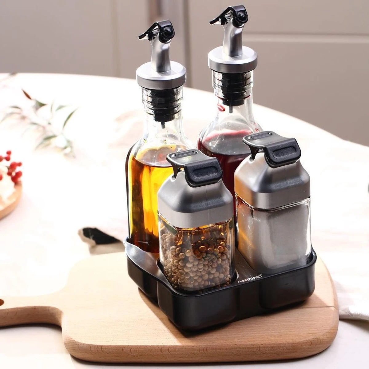 Een compact Olie en azijnstel van glazen flessen voorzien van RVS schenktuit. In een handige houder welke tevens plaats bied voor 2 specerijen potjes, welke u ook kunt gebruiken voor peper en zout. Zodat u altijd alles tijdens het eten of koken bij de hand heeft.