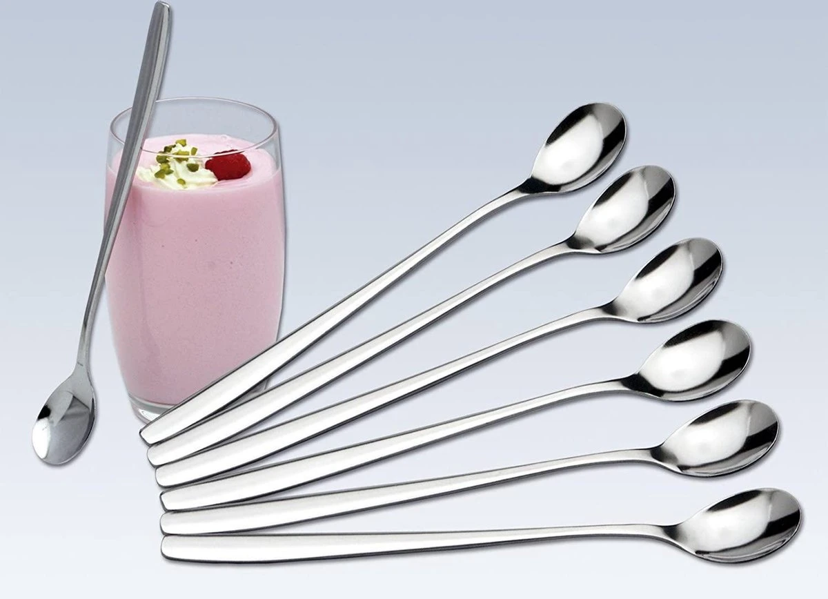 Set van 12 roestvrijstalen Latte Macchiato lepeltjes. Handig om in lange glazen te roeren of uit te scheppen.