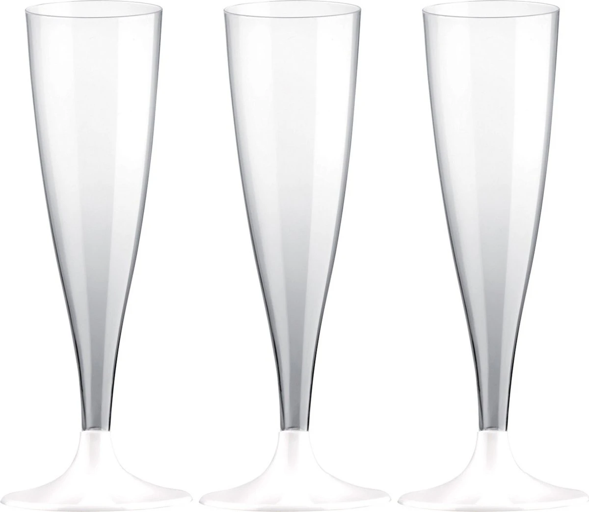 Champagneglazen/flutes kunststof 140 ml met witte voet – set 30x stuks. Transparante glazen met een inhoud van 0,14 liter en een wit voetje. Deze stevige plastic champagneglazen zijn geschikt voor koude dranken. Ideaal voor gebruik tijdens een bruiloft of feestje.Materiaal: polystyrene kunststof. Vaatwasmachinebestendig: Nee, alleen geschikt voor handafwas. Het voetje kan losgemaakt worden. Formaat per glas: diameter 5,3 cm, diameter voet 6,5 cm, totale hoogte 24 cm. Inhoud per glas: 0,14 liter/14 cl/140 ml. Herbruikbare plastic champagne glazen transparant/wit – Stevig herbruikbaar plastic champagneglas.
